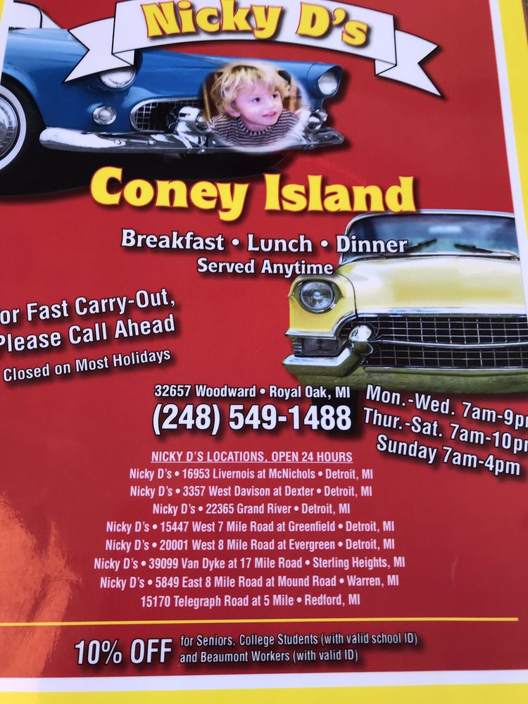 Introducing Nicky D's Coney Island, a hotspot in Royal Oak, MI offering a mouthwatering menu of hot dogs, American classics, and breakfast options. This casual yet classy establishment is perfect for groups, families, and even kids. With amenities like delivery, takeout, and wheelchair accessibility, Nicky D's aims to cater to every guest's needs. Start your day with their hearty breakfast options like the Paul Bunyan Breakfast or the French Toast Breakfast. Indulge in their flavorful omelettes such as the Western Omelette or the Mexican Omelette. Don't miss out on their breakfast sandwiches for a quick and satisfying meal. With ample parking, outdoor seating, and even Wi-Fi, Nicky D's Coney Island provides a comfortable and enjoyable dining experience for all. Don't hesitate to try their menu and experience the delicious offerings firsthand.